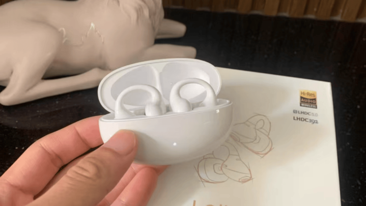 荣耀亲选 LCH SE 的充电仓采用哑光鹅卵石造型,由钛合金材质打造,触感细腻高级。耳机本体仅重5.1克,采用钛合金拱桥结构与弧形耳钩设计,兼顾轻盈与稳固。开放式形态避免了传统入耳式的压迫感,钛合金弯臂配合弹性硅胶耳钩,即使在运动场景中也能舒适佩戴,单耳使用几乎无感,对佩戴眼镜用户也十分友好。