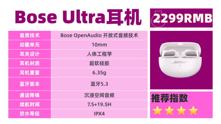 音质方面,该耳机搭载10mm动圈单元,配合Bose沉浸式空间音频技术,能带来动态与静态双模式的空间听感,高频清晰、低频饱满。同时,OpenAudio定向传声技术可以有效抑制漏音,确保声音更集中传入耳内。